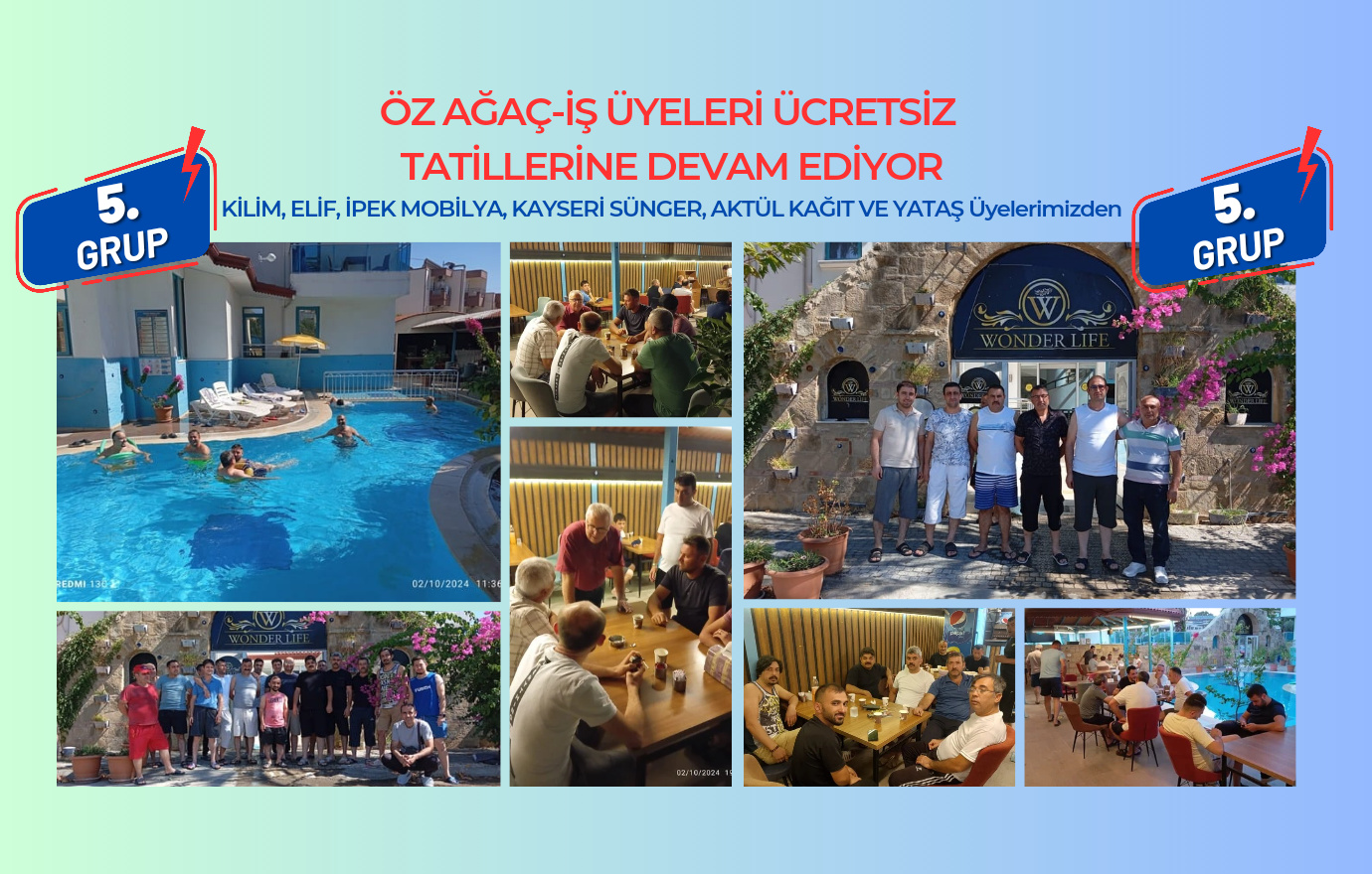 KİLİM MOBİLYA, ELİF MOBİLYA, İPEK MOBİLYA, KAYSERİ SÜNGER, AKTÜL KAĞIT, YATAŞ, ENZA HOME VE DİVAN MOBİLYA ÜYELERİMİZDEN OLUŞAN 5. GRUBUMUZ SENDİKAMIZIN OTELİNDE TATİLLERİNİ TAMAMLADI.