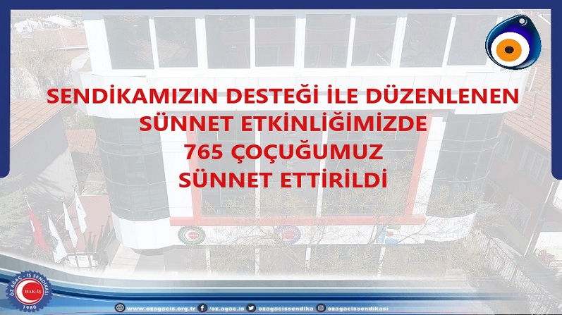 Öz Ağaç-İş Sendikası Genel Merkez Yönetimimiz tarafından düzenlediğimiz ve Haziran, Temmuz ve Ağustos ayları itibariyle büyük bir özenle yürüttüğümüz etkinliğimiz sonucunda 765 çocuğumuzu sünnet ettirdik.