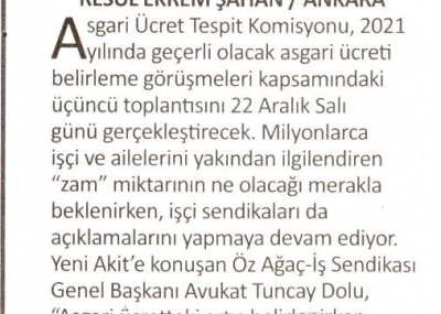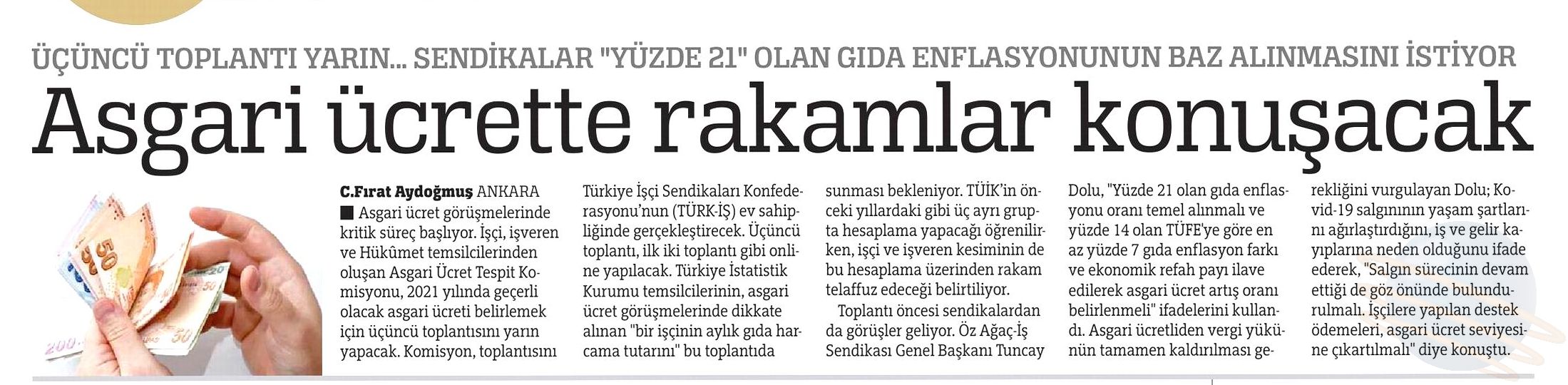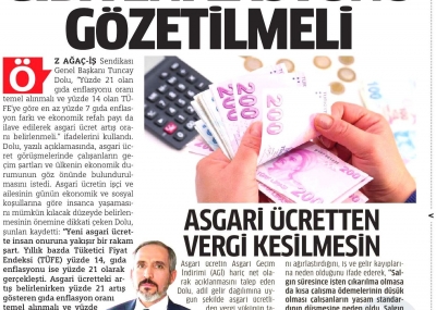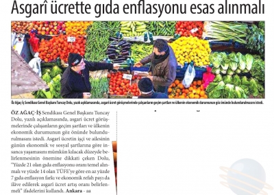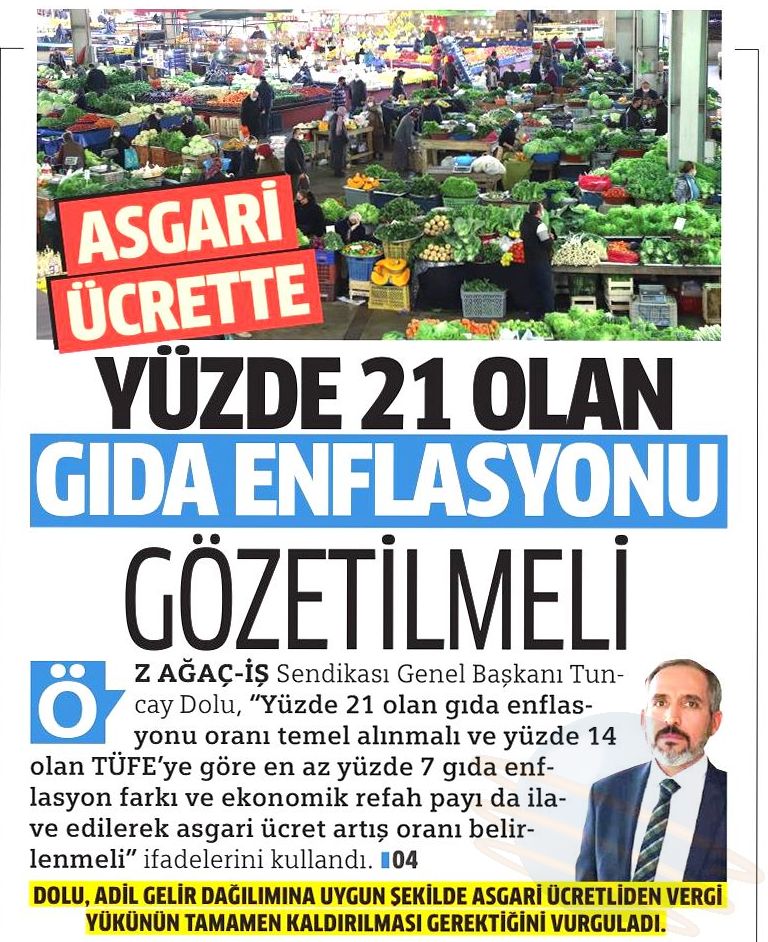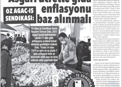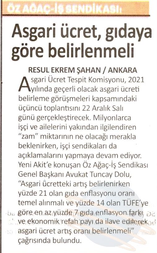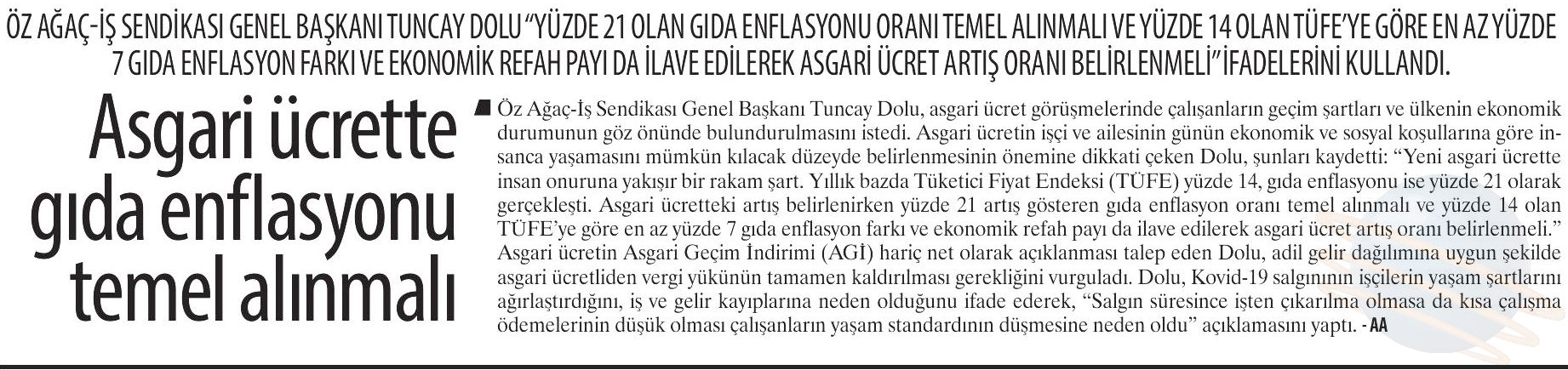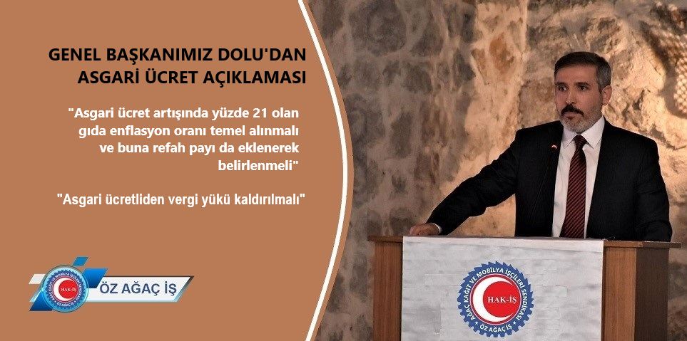 Öz Ağaç-İş Sendikası Genel Başkanı Av. Tuncay Dolu yaptığı açıklamada, Konfederasyonumuz HAK-İŞ ve diğer işçi temsilcilerinin asgari ücret konusunda aldığı ortak kararda belirtilen “ülkenin içinde bulunduğu ekonomik durum” gerekçesiyle asgari ücretin düşük belirlenmesi düşüncesinin kabul edilemeyeceğini vurguladı. Asgari ücret artışının çalışanın cebini doğrudan etkileyen gıda enflasyon oranından az olmayacak şekilde, yılsonundaki enflasyon oranlarına ilave olarak ekonomik refah seviyesi de düşünülerek belirlenmesi gerektiğini belirtti.