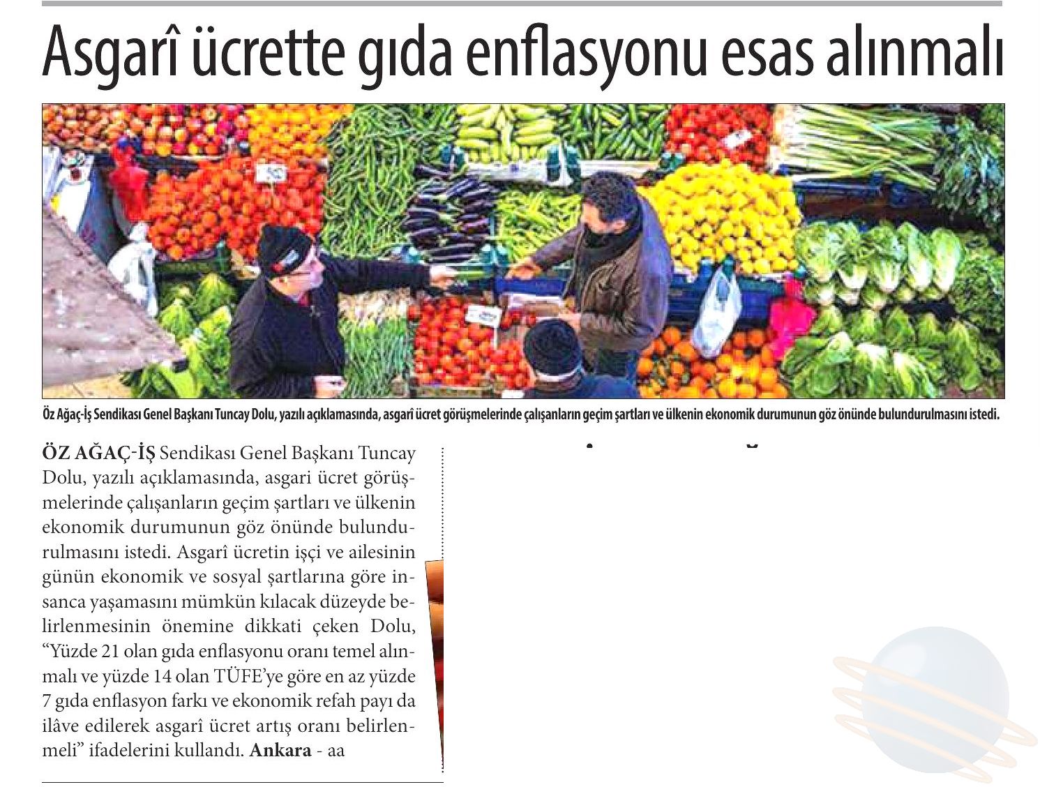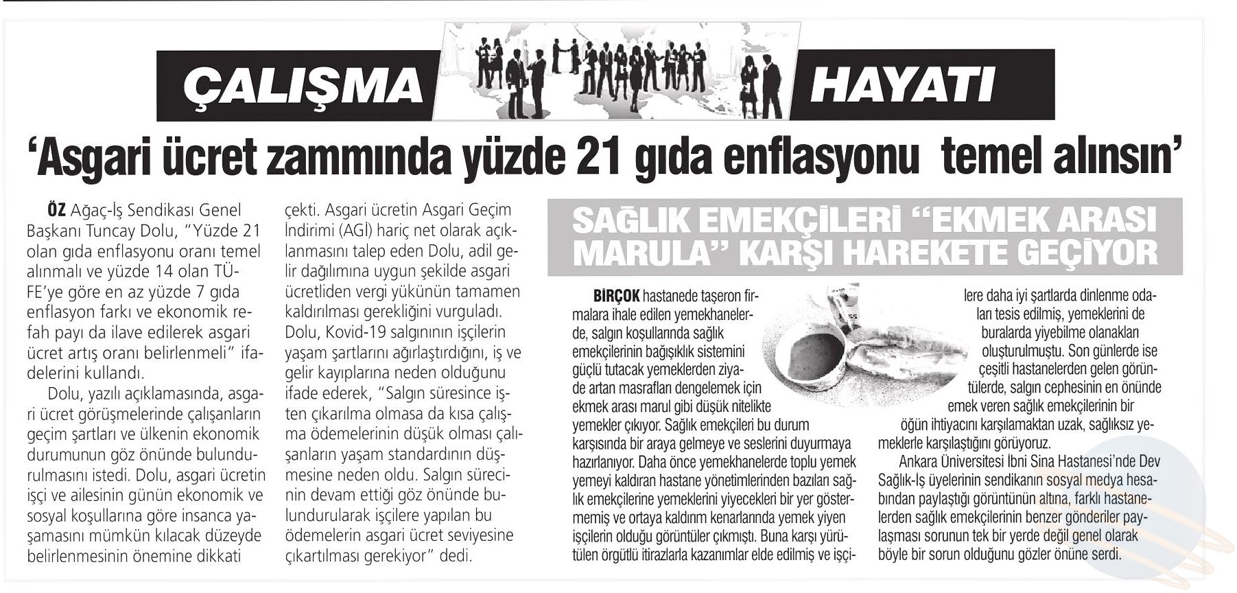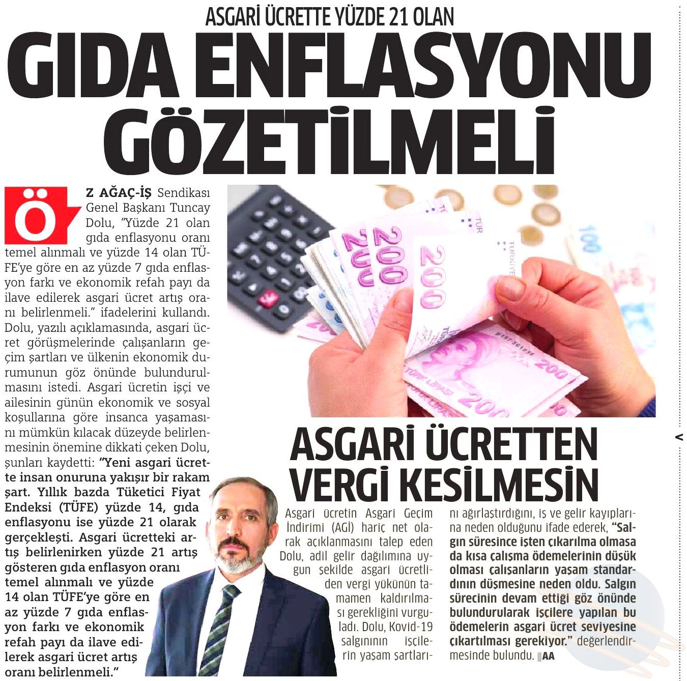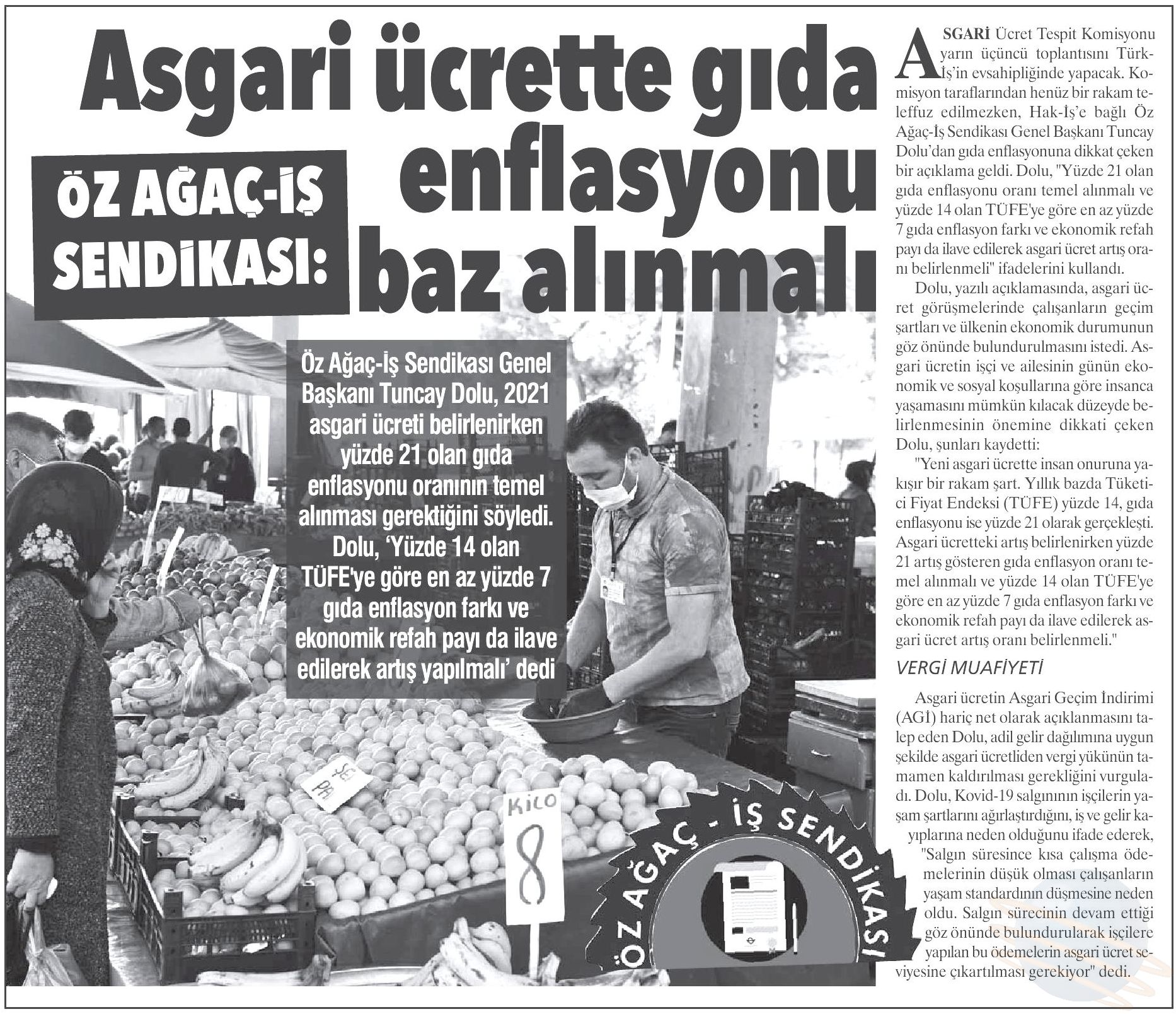 Öz Ağaç-İş Sendikası Genel Başkanı Av. Tuncay Dolu yaptığı açıklamada, Konfederasyonumuz HAK-İŞ ve diğer işçi temsilcilerinin asgari ücret konusunda aldığı ortak kararda belirtilen “ülkenin içinde bulunduğu ekonomik durum” gerekçesiyle asgari ücretin düşük belirlenmesi düşüncesinin kabul edilemeyeceğini vurguladı. Asgari ücret artışının çalışanın cebini doğrudan etkileyen gıda enflasyon oranından az olmayacak şekilde, yılsonundaki enflasyon oranlarına ilave olarak ekonomik refah seviyesi de düşünülerek belirlenmesi gerektiğini belirtti.