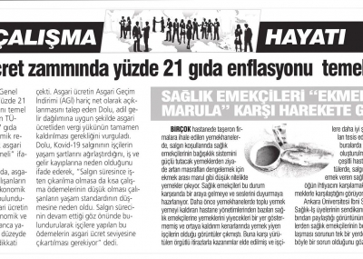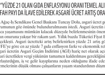 İnsan onuruna yaraşır bir ücret artışının şart olduğunu ifade eden Dolu, “Yıllık bazda Tüketici Fiyat Endeksi (TÜFE) yüzde 14, gıda enflasyonu ise yüzde 21 olarak gerçekleşti. Asgari ücretteki artış belirlenirken yüzde 21artış gösteren gıda enflasyon oranı temel alınmalı ve yüzde 14 olan TÜFE’ye göre en az yüzde 7 gıda enflasyon farkı ve ekonomik refah payı da ilave edilerek asgari ücret artış oranı belirlenmeli.”