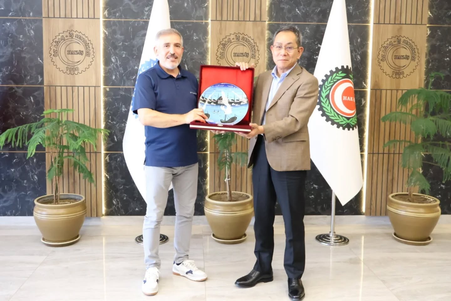 Karşılıklı iyi dilek temennileri ile sohbet havasında geçen görüşmede Genel Başkanımız Dolu, Toshiki Yamagami'ye hatıra plaket hediye etti.