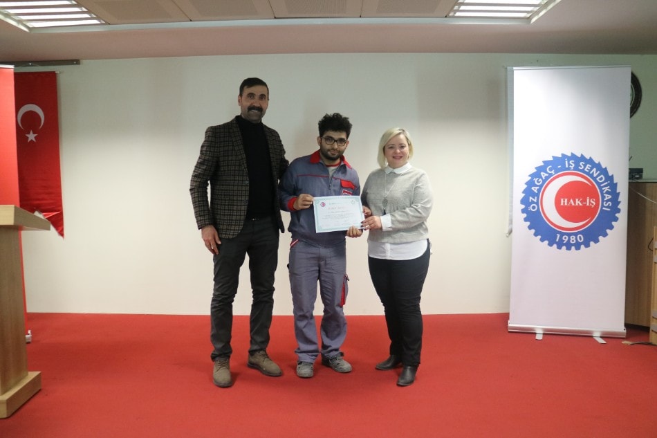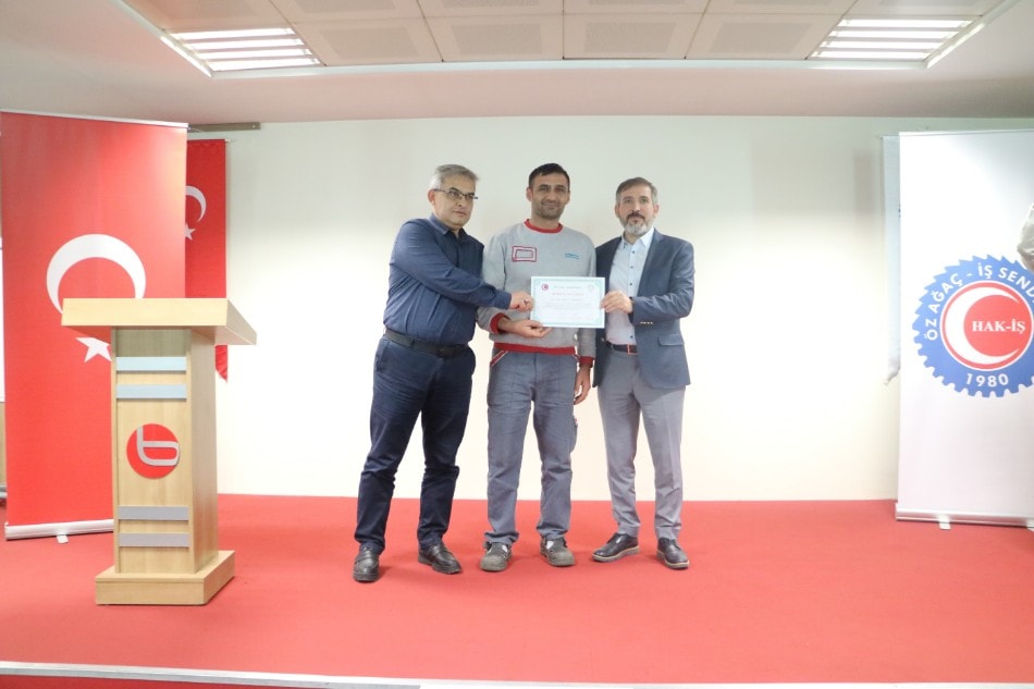 Programın ardından eğitime katılan üyelerimize Genel Başkanımız Av. Tuncay Dolu, Genel Başkan Yardımcımız Emin Hayta, Genel Sekreterimiz Rıfat Ülger, ile Bellona insan kaynakları müdürü Ali Gülhan tarafından sertifikaları verildi.
