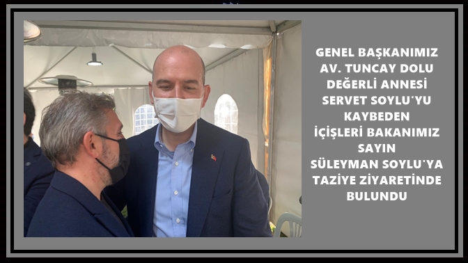 Genel Başkanımız Av. Tuncay Dolu, Genel Başkan Yardımcımız Mert Doğan Bozkır ile birlikte gerçekleştirdikleri taziye ziyaretinde, İçişleri Bakanımız Süleyman Soylu'nun kıymetli annesi Servet Soylu Hanımefendinin vefatından duydukları üzüntüyü dile getirdi.