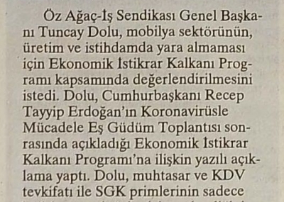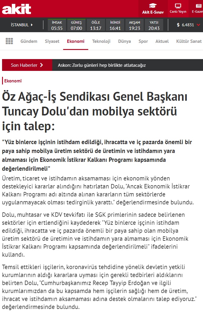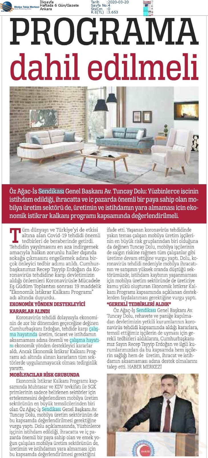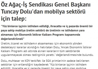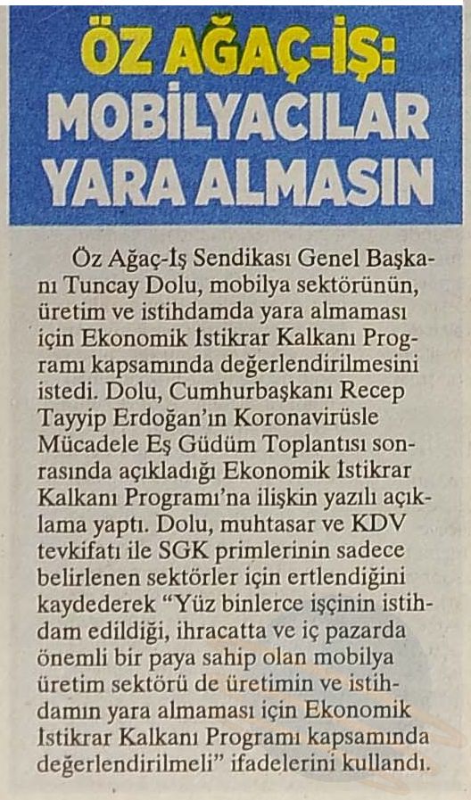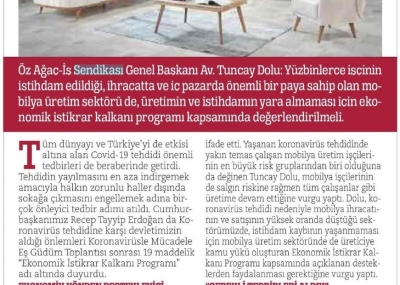 Ekonomik İstikrar Kalkanı Programı kapsamında Muhtasar ve KDV tevkifatı ile SGK primlerinin sadece belirlenen sektörler için ertelenmesini değerlendiren mobilya üretim sektörünün en büyük temsilcilerinden biri olan Öz Ağaç-İş Sendikası Genel Başkanı Av. Tuncay Dolu, mobilya üretim sektörünün de bu kapsamda değerlendirilmesi gerektiğine vurgu yaptı.