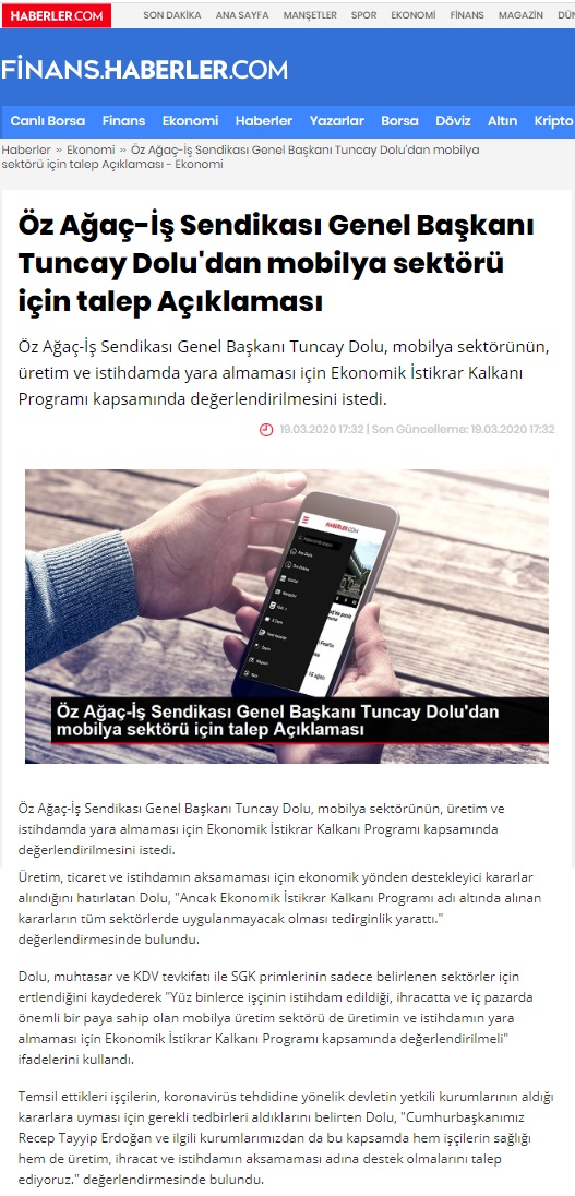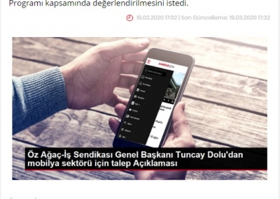 Dolu açıklamasında, Yüzbinlerce işçinin istihdam edildiği, ihracatta ve iç pazarda önemli bir paya sahip olan ve emek yoğun çalışılan mobilya üretim sektörünün de, üretimin ve istihdamın yara almaması için bu kapsamda değerlendirilmesi gerektiğini ifade etti. Yaşanan koronavirüs tehdidinde yakın temas çalışan mobilya üretim işçilerinin en büyük risk gruplarından biri olduğuna da değinen Tuncay Dolu, mobilya işçilerinin de salgın riskine rağmen tüm çalışanlar gibi üretime devam ettiğine vurgu yaptı. Dolu, koronavirüs tehdidi nedeniyle mobilya ihracatının ve satışının yüksek oranda düştüğü sektörümüzde, istihdam kaybının yaşanmaması için mobilya üretim sektöründe de üreticiye kamu yükü oluşturan Ekonomik İstikrar Kalkanı Programı kapsamında açıklanan desteklerden faydalanması gerektiğine vurgu yaptı.