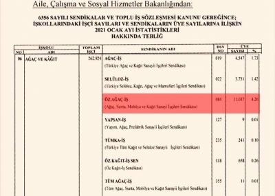 Aile, Çalışma ve Sosyal Politikalar Bakanlığı, 6356 sayılı Kanun gereğince, Ocak 2021 işçi sendikaları üye sayısı istatistiklerini açıkladı.