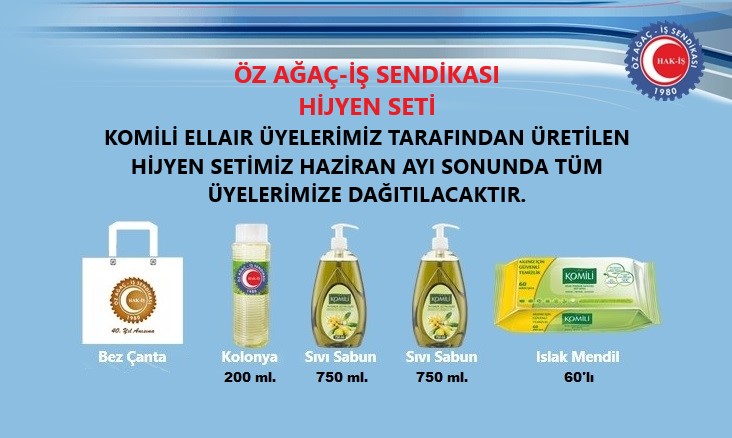 İçerisinde 1 adet bez çanta, 1 adet 200 ml kolonya, 2 adet 750 ml sıvı sabun ve 1 adet 60'lı ıslak mendilin bulunduğu hijyen setlerimiz Haziran ayı sonunda tüm üyelerimize temsilcilerimiz tarafından dağıtılacaktır.