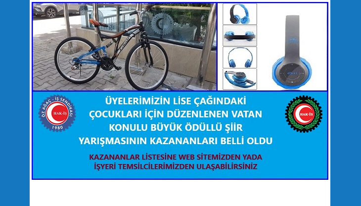 Öz Ağaç-İş Sendikamızın düzenlediği üyelerimizin lise çağındaki çocukları için düzenlenen vatan konulu büyük ödüllü şiir yarışmasının kazananları belli oldu.